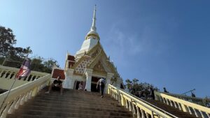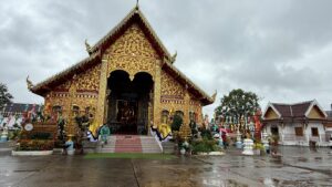 V mestu vlada kar malo cestni kaos, a naju ne zmoti. Najin cilj je budistični templj Wat Pha That Doi Wao. Mnogi mu rečejo tudi škorpijonov tempelj. Zgrajen je bil kot spomenik padlemu mjanmarskem vojaku. Del tempeljskega kompleksa je tudi Skywalk (1,5€/osebo). Razgedna točka na mesto Tachilek (Mnjamar).