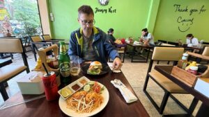 Tradicionalne jedi: laoška klobasa, pa juhe z nudelci, ribe, žabe,….. Izbereva juho z nudelci Khao Soy (pikantna), laoško klobaso, svinjski steak z zelenjavo in jagodni smoothi. Za piko na i pa še kokosovo palačinko. Vse skupaj 9€.
