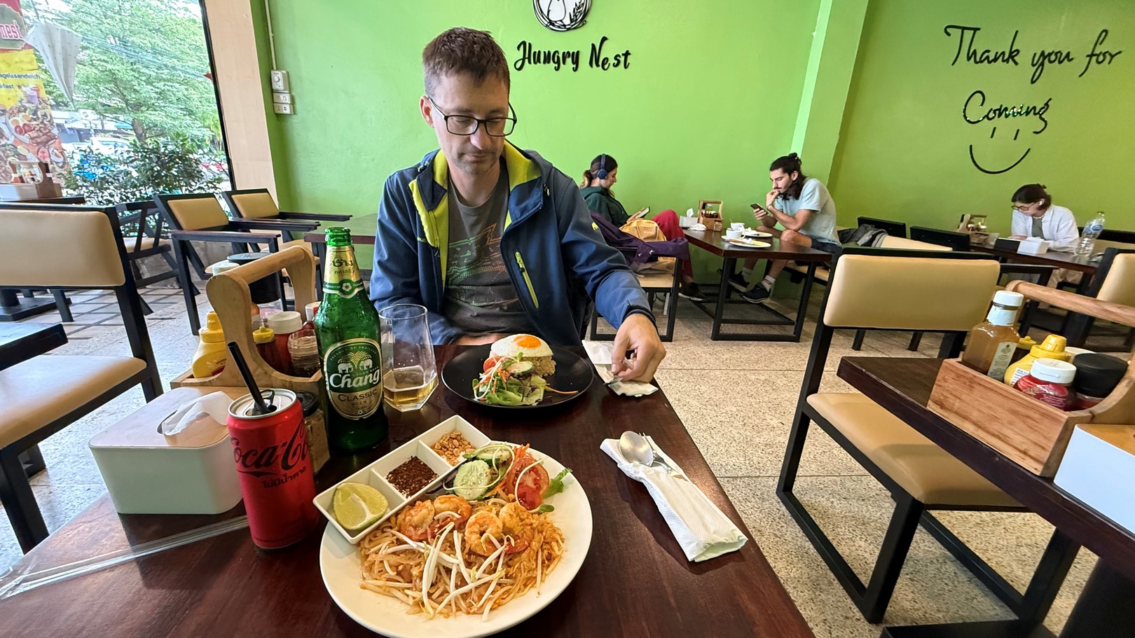 Kosilo si privoščiva kar v restavraciji ob kompleksu. Jaz juho z nudelni in govedino, Miha pa piščančji pad thai.