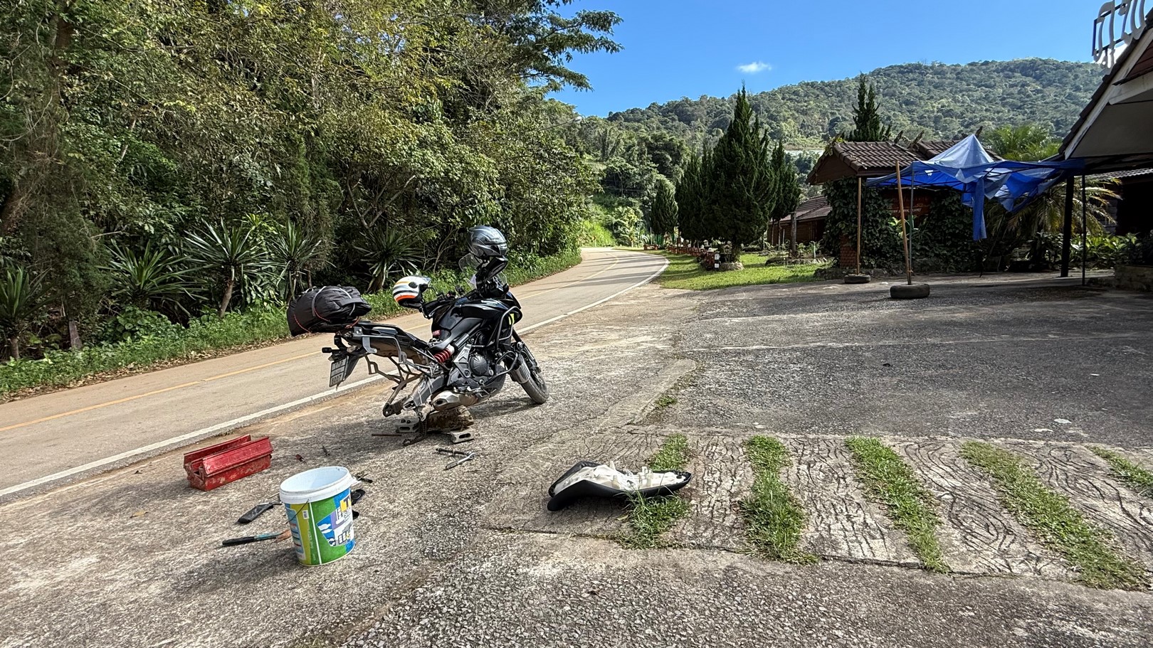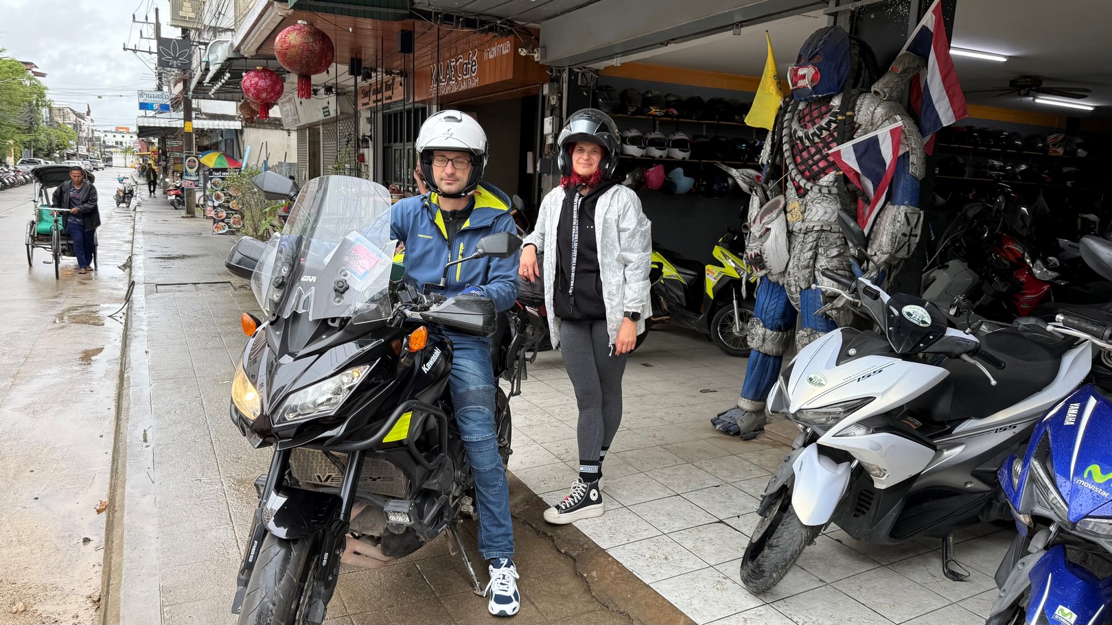 Motor sva rezervirala že vnaprej pri Big bike rent a bike. Rentala sva Kawasaki Versys, ki nama še ni poznan. Okoli 12tih dež poneha in motor je pripravljen. Misija raziskovanja severne Tajske naj se začne.