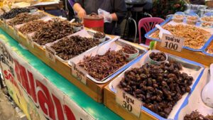 Po poti dalje zagledava prva riževa polja, v večjih mestih pa tržnice pod šotori iz katerih se kadijo različne arome. Ob eni tržnici narediva postanek, spijeva smoothi in narediva krog med stojnicami. Ponudba zajema od ocvrtih hroščev do cvetja in pasjih mladičev.