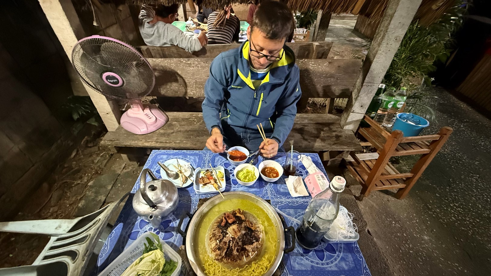 Večerja je danes žar pri sosedih, ki vsak večer naredijo pravi šov za udeležence zanke Thakhek.