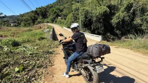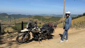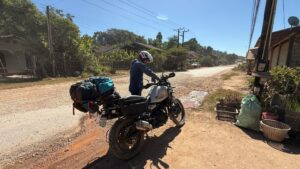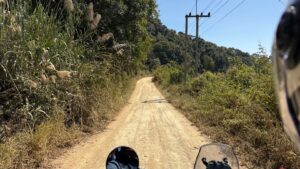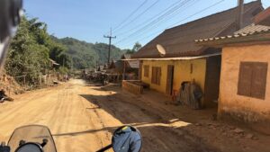 Preostanek poti naju spremlja dolina s polno goveda, drobnice in kokoši na cesti. Prašna sva kot da bi se vozila po Sahari. Domačini, ki imajo razne stojnice močijo ceste. Z Mihom resno razmišljava, da enega od njih prosiva, da nama umije motor, ker na njem stoji prah v centimetrih. Na cilju pa zopet malo več gneče, predvsem zaradi del. Miha v enem trenutku celo vpraša, a sva zdaj v megli. Ne nisva! Sva v prahu. Vozila sva se nekje sedem ur s postanki.