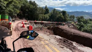 Cesta se nato začne vzpenjati in doseževa najvišjo nadmorsko višino 1.900m z razgledno točko Col (sva iskala na različnih zemljevidih ime gorovja, pa nikjer nič). V Evropi bi temu rekli prelaz itd, tu pa imajo sicer urejeno foto točko in turisti/motoristi se pogosto ustavijo za sliko. Se pa na tem odseku ureja cesta, tako da se bo v prihodnosti verjetno veliko spremenilo. Malo za nama pride tudi italijanska skupina motoristov. Kosilo na “prelazu”, danes že drugič juha z nudelci, nato pa spust iz gore. Enkrat mimo tovornjaka po levi, drugič po desni, tako pač je.