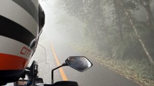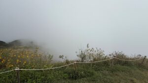 Motor pustiva na urejenem parkirišču nato pa se povzpneva do vrha, nekje petnajst minut hoje. Žal nama postane hitro jasno da razgleda tokrat ne bo. Megla se vije vsepovsod naokoli. Vseeno vstopim v Laos in to brez dokumentov. Vstopnine ni, le primerna obutev je potrebna, ker je potka spolzka.