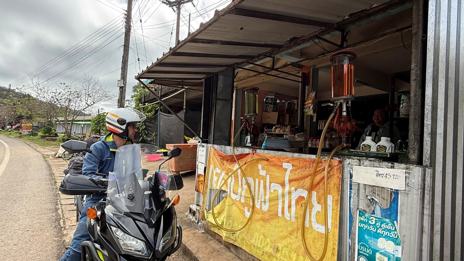 Natankava gorivo na stojnici, kjer je sicer malo dražje kot na pravih bencinskih postajah. Potem pa trenutek za katere res upaš, da se na poti sredi neznanega z motorjem ne bo zgodil.