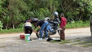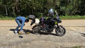 Ti se takoj odzovejo, prinesejo orodje, odstrani se guma, motor gre na klocne in Miha je že na poti z enim od domačinov k vulkanizerju. Skoraj dve uri kasneje imava sicer za silo po Mihovih besedah gumo zaflikano. V tem času se je nabrala množica pomočnikov, ki vsak doda nekaj kako gumo nazaj namontirat.