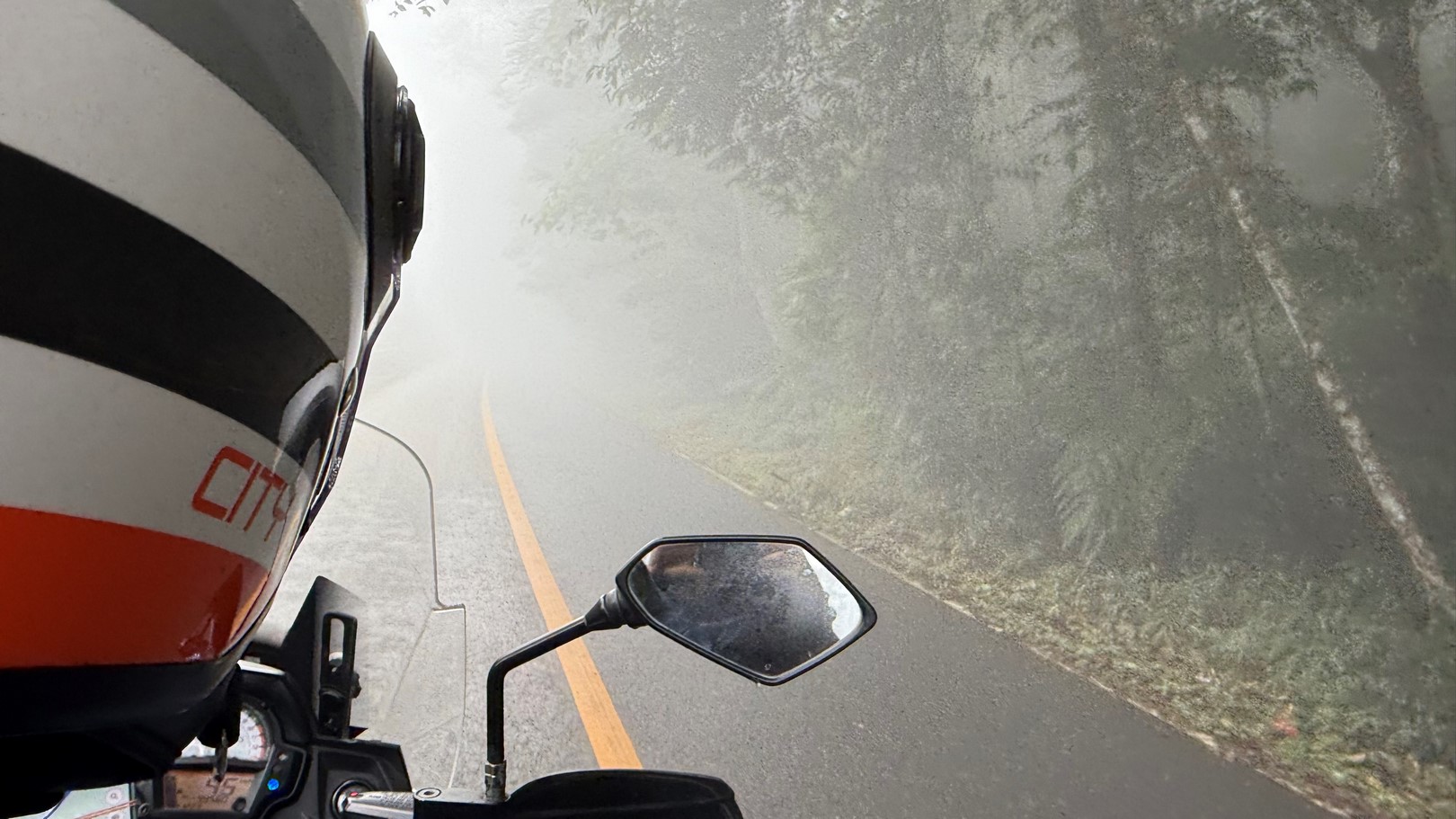 Idilično, dokler megla ne skrije razgleda in morava upočasniti, da sploh kaj vidiva. Mogoče spet ne bo nobenega razgleda ampak tokrat imava srečo.