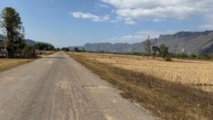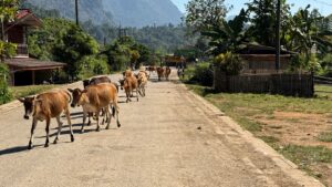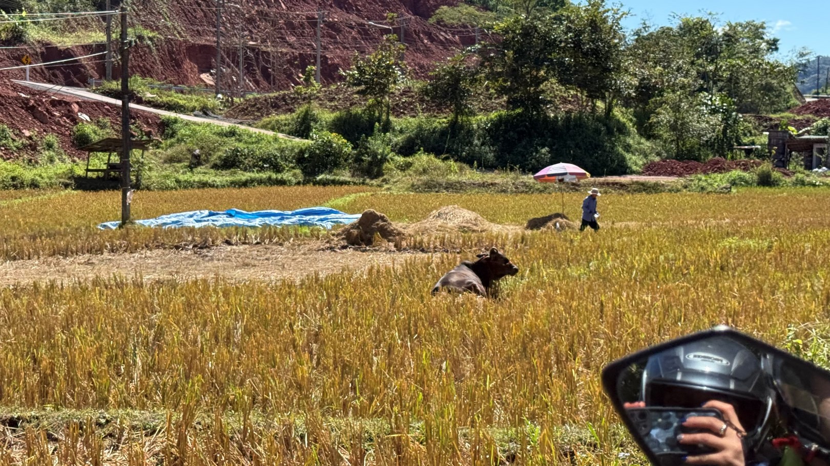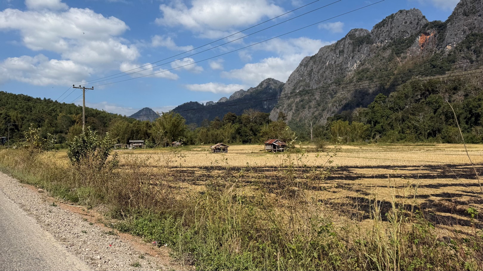 Iz razgleda pobegneva pred gnečo, ki se dobesedno vije proti vrhu. Vang Vieng je popularen za Kitajce, ki se sem pripeljejo s hitrim vlakom, pogosto za vikend itd. Odločiva se narediti krog po delu, ki je čisto podeželski. Po cesti se sprehajajo bivoli in govedo, ki se ne dajo motiti. Ljudje hodijo na polja ali pa se držijo v domači senci. Ni neke gneče in potrebe po gasu, le vožnja med polji riža.