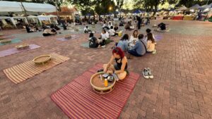 Ponuja se pa od hrane, pijače, oblačil in nakita. Domačini hrano sproti pripravljajo, po nakupu željene hrane pa lahko le to poješ na preprogi z mizico. Midva sva vzela različno, najprej meso (piščanca in nudelce za nekje 8€). Ima pa ta tržnica tak poseben čar, le alkohola ne prodajajo, pa si je moral Miha po pir v trgovino.