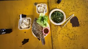 Oba sva mnenja, da greva raje pogledat nočni bazar kjer pa je pravo zatišje. Izbereva si ribo, riž in zelenjavo, ki jo nama na to spečejo. Gre na princip: Hrana je razstavljena izbereš kaj in ti pripravijo. V spremljavi lokalnih glasbenikov uživava v najini pojedini.