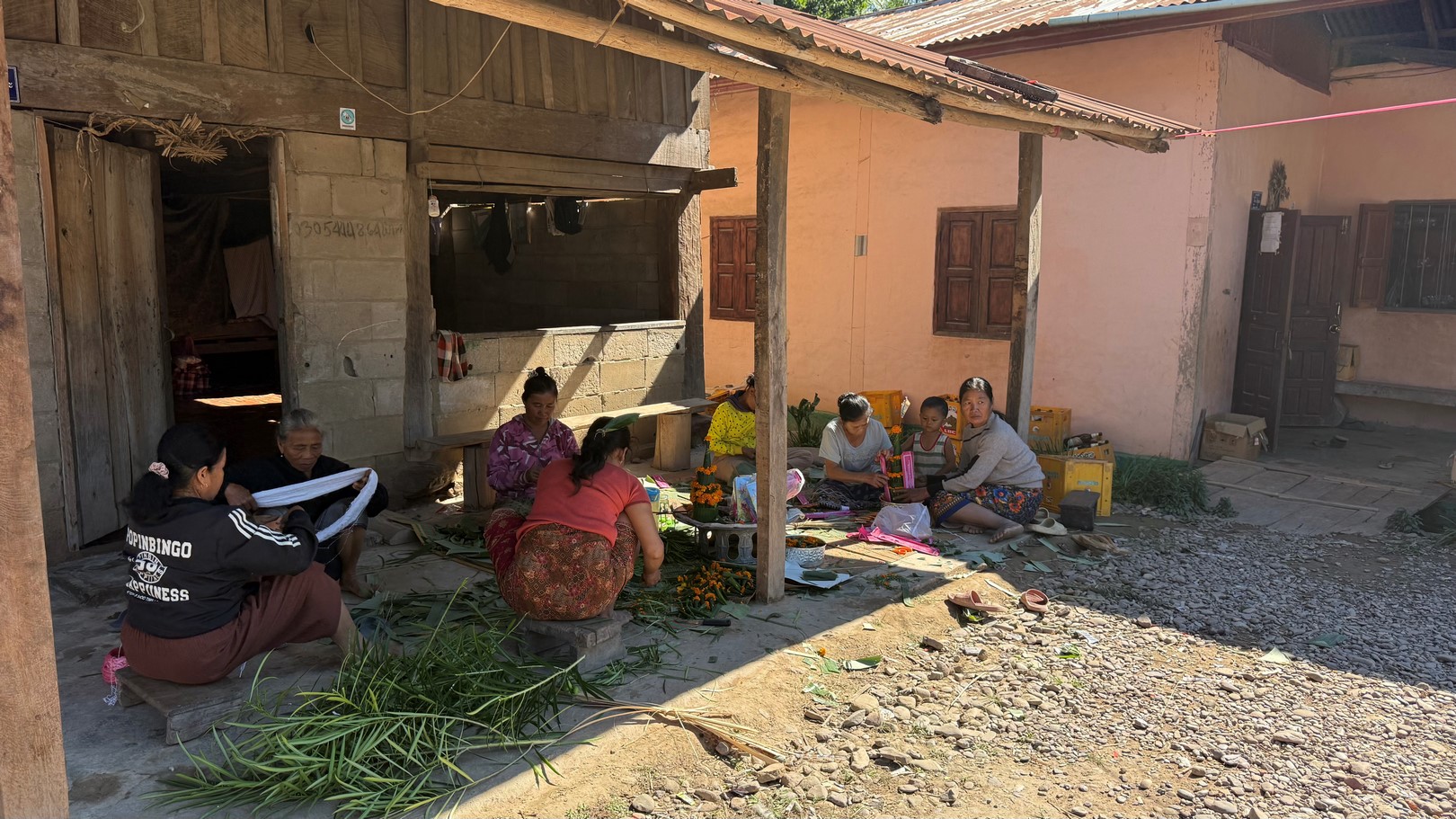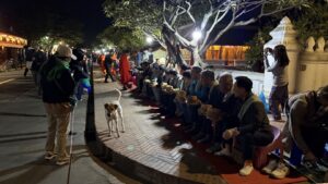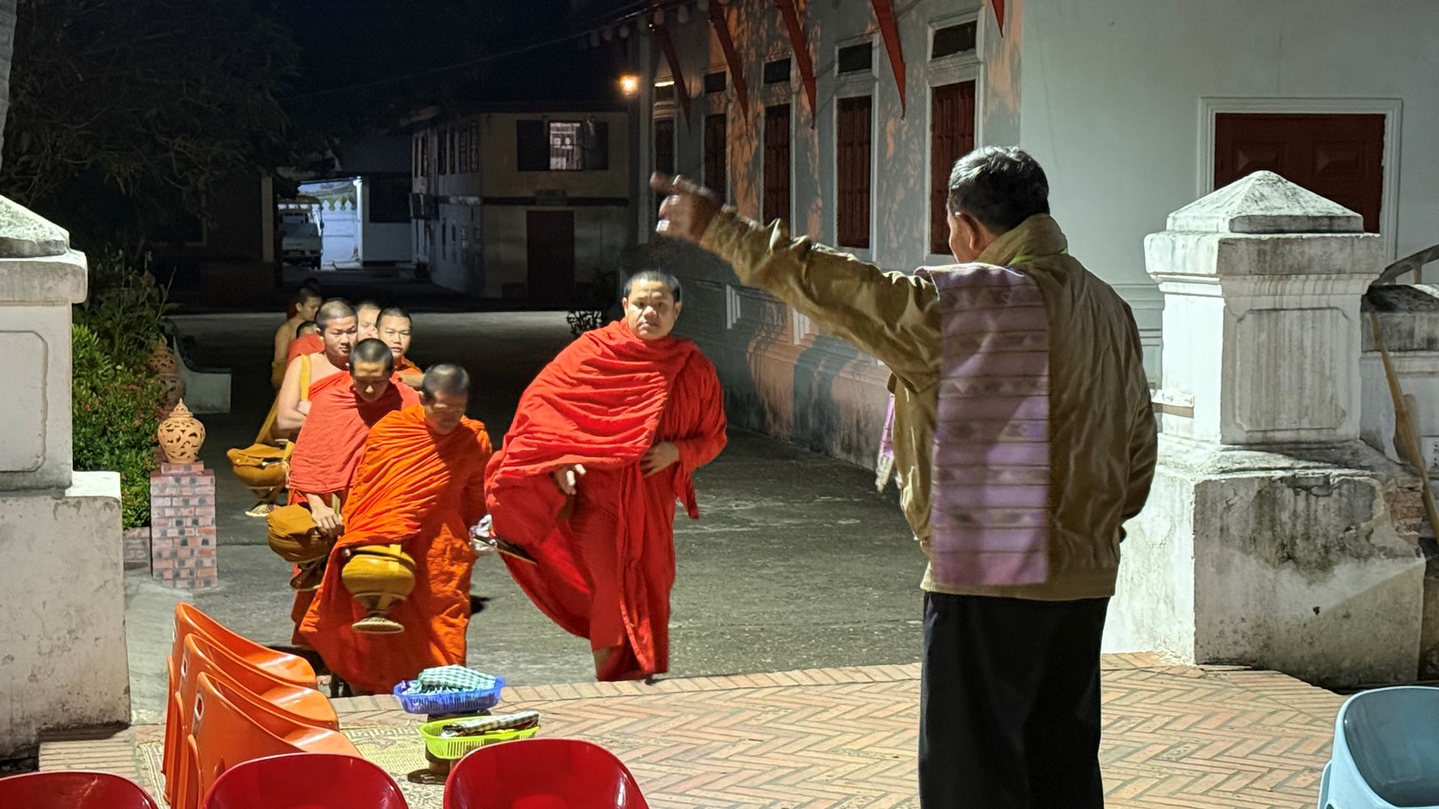 V temi medtem ko prvi domačini postavljajo stojnice se midva odpraviva na obred dajatev miloščine (Alms giving ceremony/Tak Bat or Sai Bat). Slovesnost tak bat se začne ob zori, ko menihi oblečeni v žafranasta oblačila, tvorijo procesijo v vrsti. Hodijo bosi po ulicah in s seboj nosijo sklede za miloščino, medtem ko se domačini zbirajo ob poti, da bi ponudili hrano in druge predmete. Miloščina lahko vključuje lepljiv riž, sadje, sladkarije in druge potrebščine.