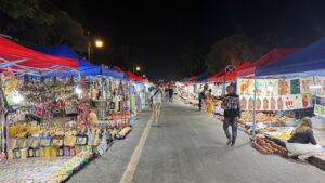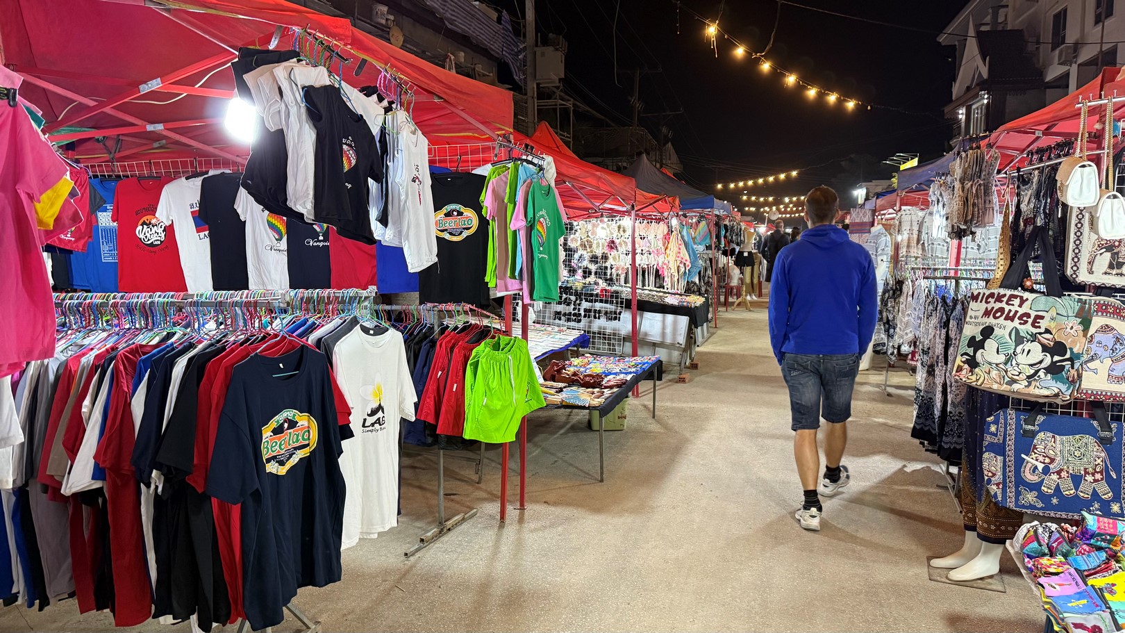 Nadaljujeva po ulici Sisavangvong, kjer je polno trgovin z ročnimi izdelki, barov. Poleg tega je ulica prizorišče nočne tržnice, zato je polna stojnic z raznimi ročnimi izdelki od nakita, oblačil, kuhinjskih pripomočkov in seveda hrane, ki je zelo različna.