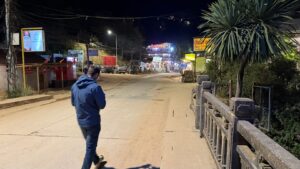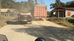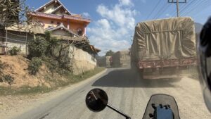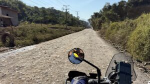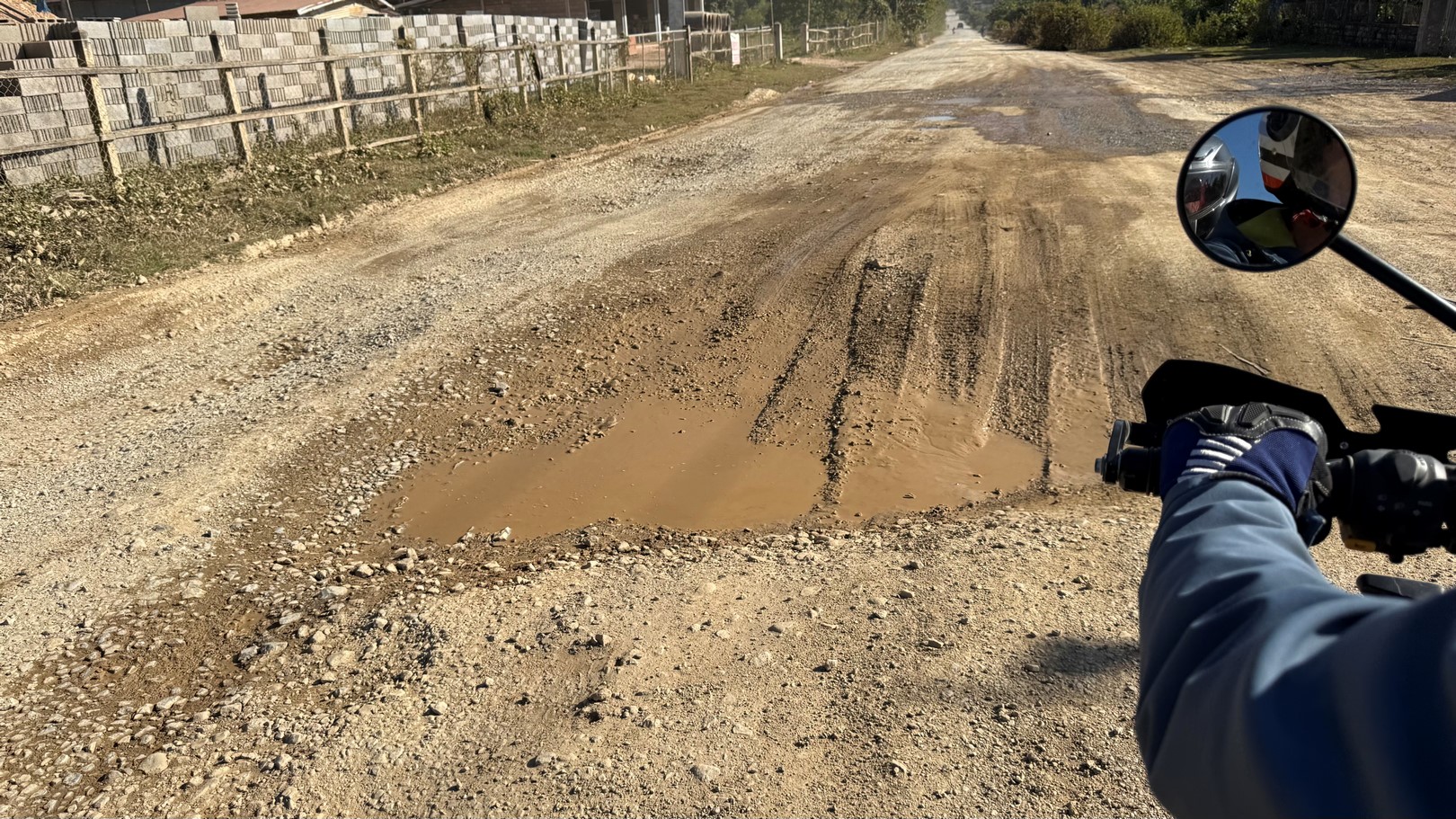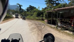 Midva bi cesto lahko opisala, kot preluknjan švicarski sir. Na začetku poti se voziš skozi mesta/vasi, kjer je ponekod čez celo mesto/vas makadam in se tako praši, da domačini polivajo cesto z vodo. Poleg makadama so še globoke luknje/jame v katere ni dobro zapeljati. Nato se vasi umaknejo, cesta pa je makadam z mešanico uničenega asfalta. Najina družba so tovornjaki, ki so polni tovora in komaj vozijo, ali pa se kvarijo. Miha spretno prehiteva, enkrat levo enkrat desno. Tudi drugi udeleženci ne upoštevajo več strani, važno se je izmakniti luknjam.