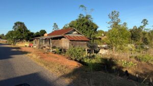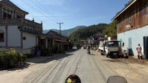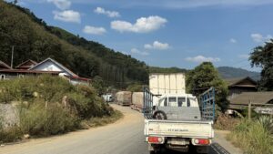 V štirih urah vožnje do najine naslednje točke Nong Khiaw sva se vozila bolj počasi in v gneči. Luknje so res pogoste, izmikajo se jim vsi ne glede po kateri strani ceste vozijo. Pogost je tudi makadam, tovornjaki in ni da ni. Ob poti so manjše vasice, ki pogosto nimajo tekoče vode.