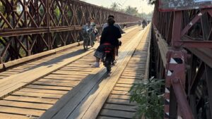 Odpeljeva se po prtljago v namestitev, tankati in že sva na poti. Prvi znak, da tole ne bo preveč podobno tajski moto avanturi je leseni Stari most (Old bridge), ki velja bolj za turistično atrakcijo a se kljub nevarnosti še vedno uporablja. Prečkanje le tega ponudi lep razgled na reko Nam Khan in življenje ob njej. Most je bil zgrajen v času Francosko-Tajskega boja za oblast na Laosom; leta 1920.