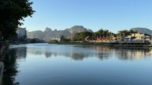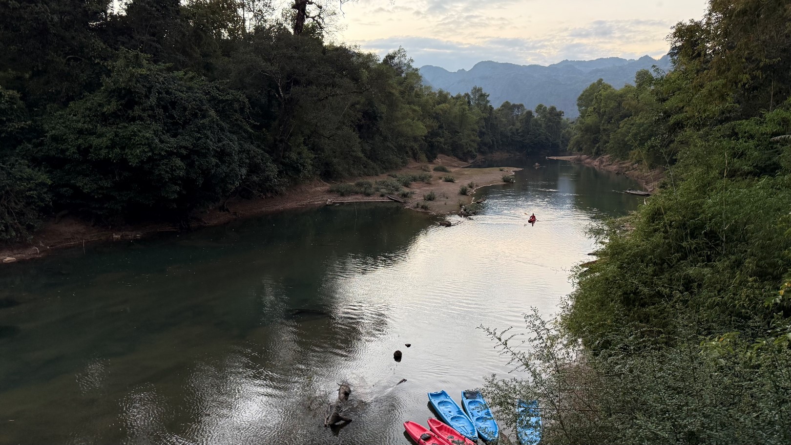 Dan posvečen raziskovanju province Vang Vieng. Najprej jutranji sprehod do reke Nam Song. Domačini že pripravljajo kajake in čolne za prve turiste.