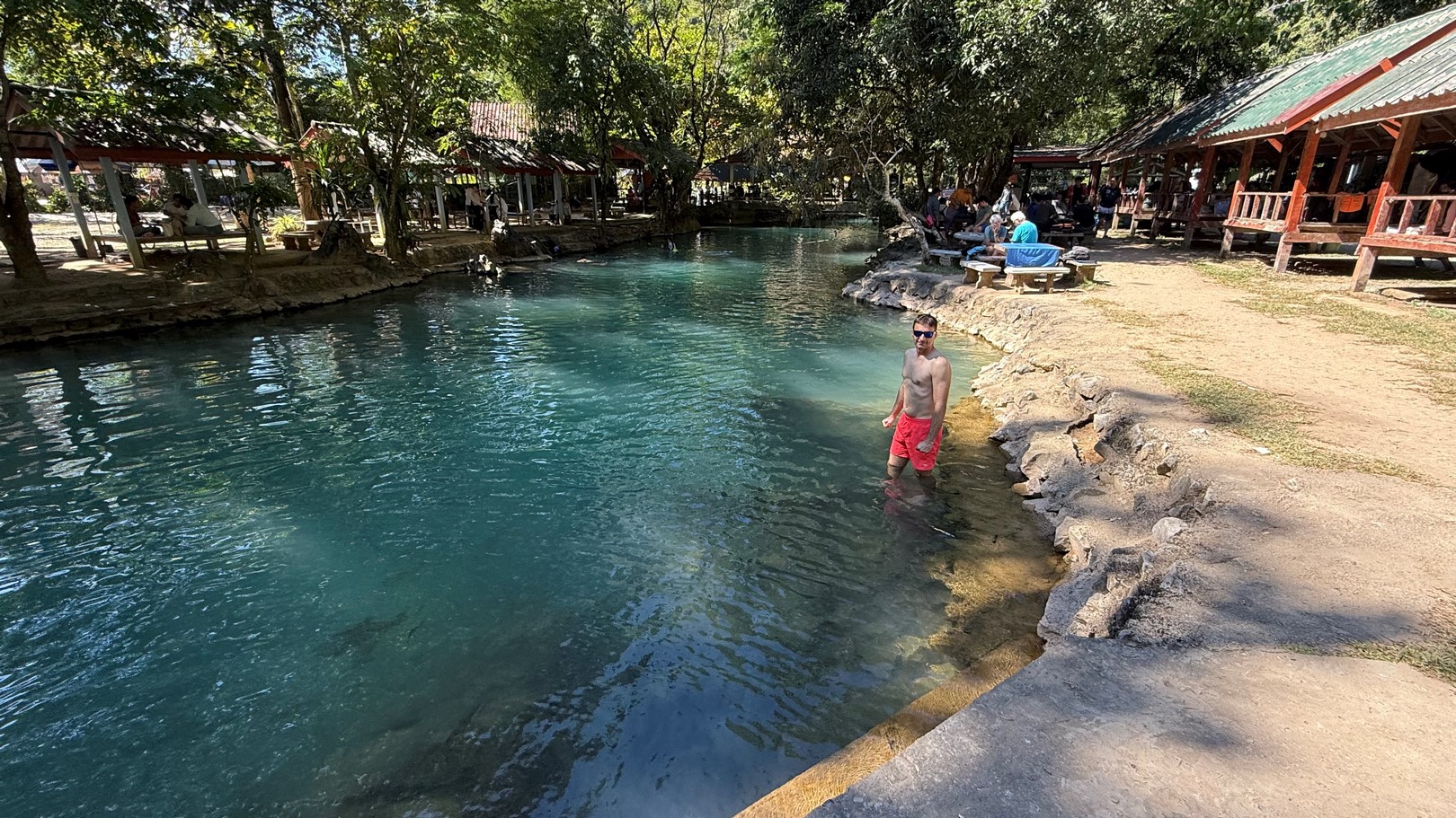 Poleg razglednih točk je v Vang Viengu popularno kopanje v lagunah. To so naravni bazeni, katerim ozadje so apnenčaste gore. Najbolj popularna je laguna številka 1, ki je najbližje mestu, v osnovi pa jih je pet. Obiščeva Laguno 3, ki je v senci in posledično nobenem od nama ni za kopanje. Greva še k laguni 1, pa je gneča, bolj sicer po lokalih in ležalnikih kot v vodi. Miha zaplava, meni nekak kar ni. Vstop v lagune je plačljiv 0,80€/osebo.