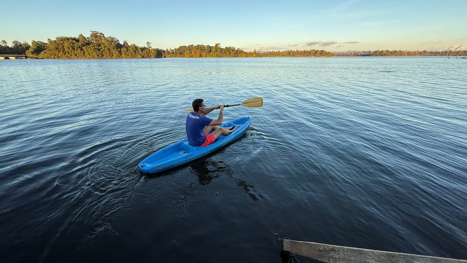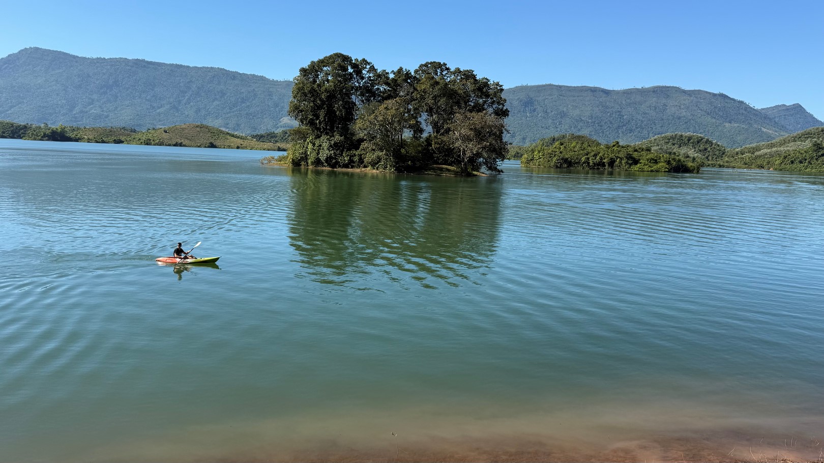 Miha izkoristi ponujeni kajak in se odpravi po jezu, jaz pa odprem debato z Nizozemcem, ki kolesari tu mimo iz Tajske do Kambodže. Vsakem svoje bi se reklo.
