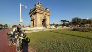 V prestolnici vlada kaos, gneča in vse stoji. Prehiteva se le z motorji po pločnikih, vmes in kjer se le da. Prvo se ustaviva na avtobusni postaji, kjer dobiva karte za večerni bus in odloživa prtljago. Nato sledi vrnitev motorja. Vmes se ustaviva pri kopiji pariškega slavoloka zmage (Arch de Triomphe); Patuxai. Zgrajen med letoma 1957 in 1968 je vojni spomenik v čast tistim, ki so se borili za neodvisnost Laosa od Francije leta 1949.