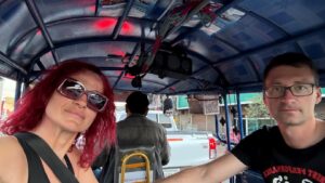 Ob pol treh zjutraj; po sumljivi vožnji s tuk tukom, prispeva v glamping sredi mesta. Odpraviva se dalje spat.