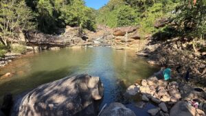 Prva ura vožnje je kar naporna. Tovornjaki, prah, vročina in luknje na cesti. V daljavi sicer vidiva prve kamnite gore, a pozornost je ves čas bolj na cesto. Prvi postanek narediva ob reki Thafalang. Mnogi se tu kopajo, midva pa sva samo spila pijačo in namočila noge.