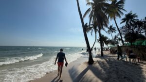 Po ogledih se odpraviva poiskati plažo za poležavanje in kopanje. Prevoziva kar nekaj ulic, ki so ob plažah, pa plaže niso ravno kaj preveč lepe. No ponekod je tako velika plima, da plaže sploh ni. Na koncu Miha zaplava na plaži Sai Noi.